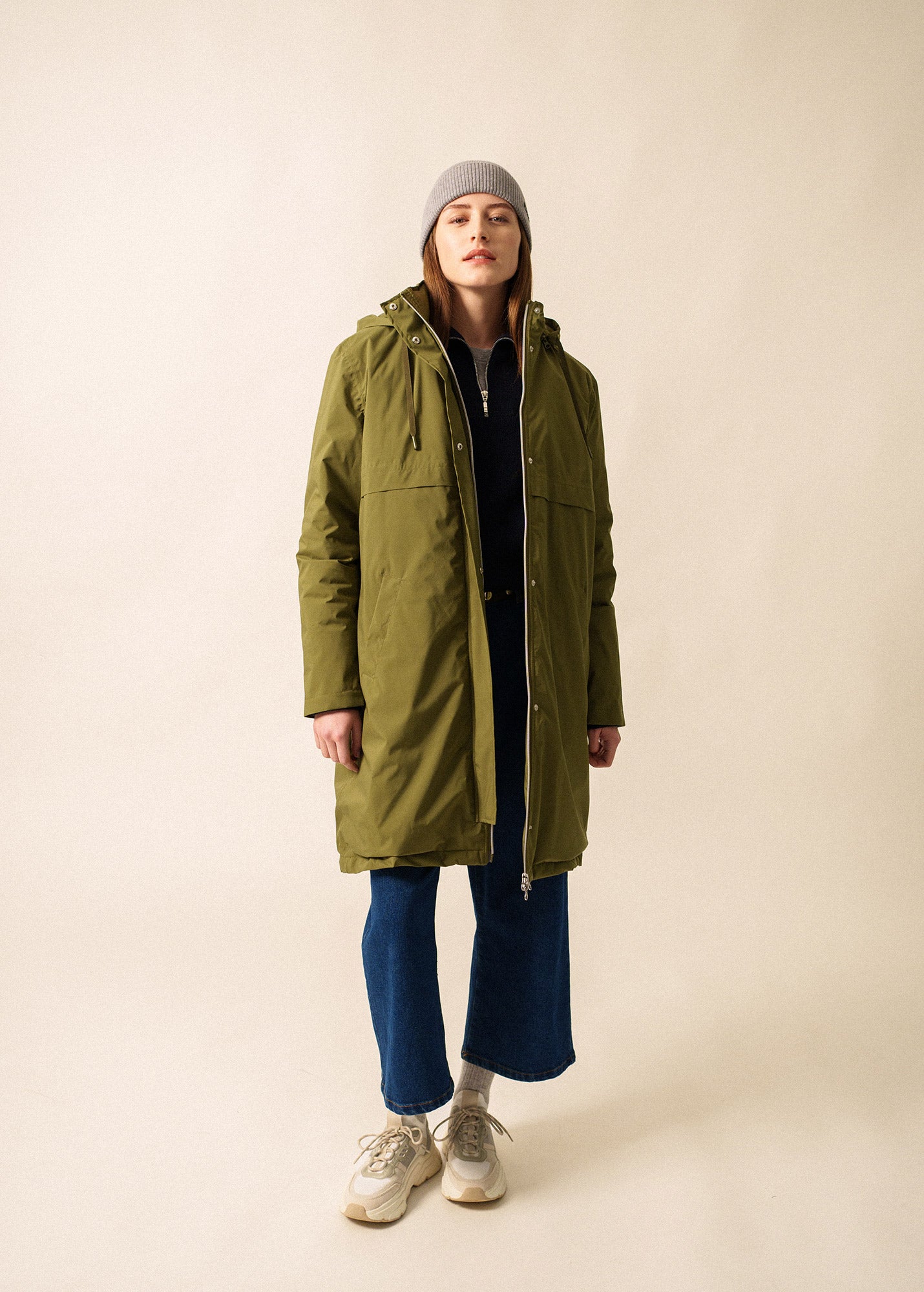 Its double-closure system - zipper and snap buttons - ensures added weather resistance, while ribbed cuffs lock in heat. The removable hood offers adaptable coverage, making this coat as versatile as it is chic.